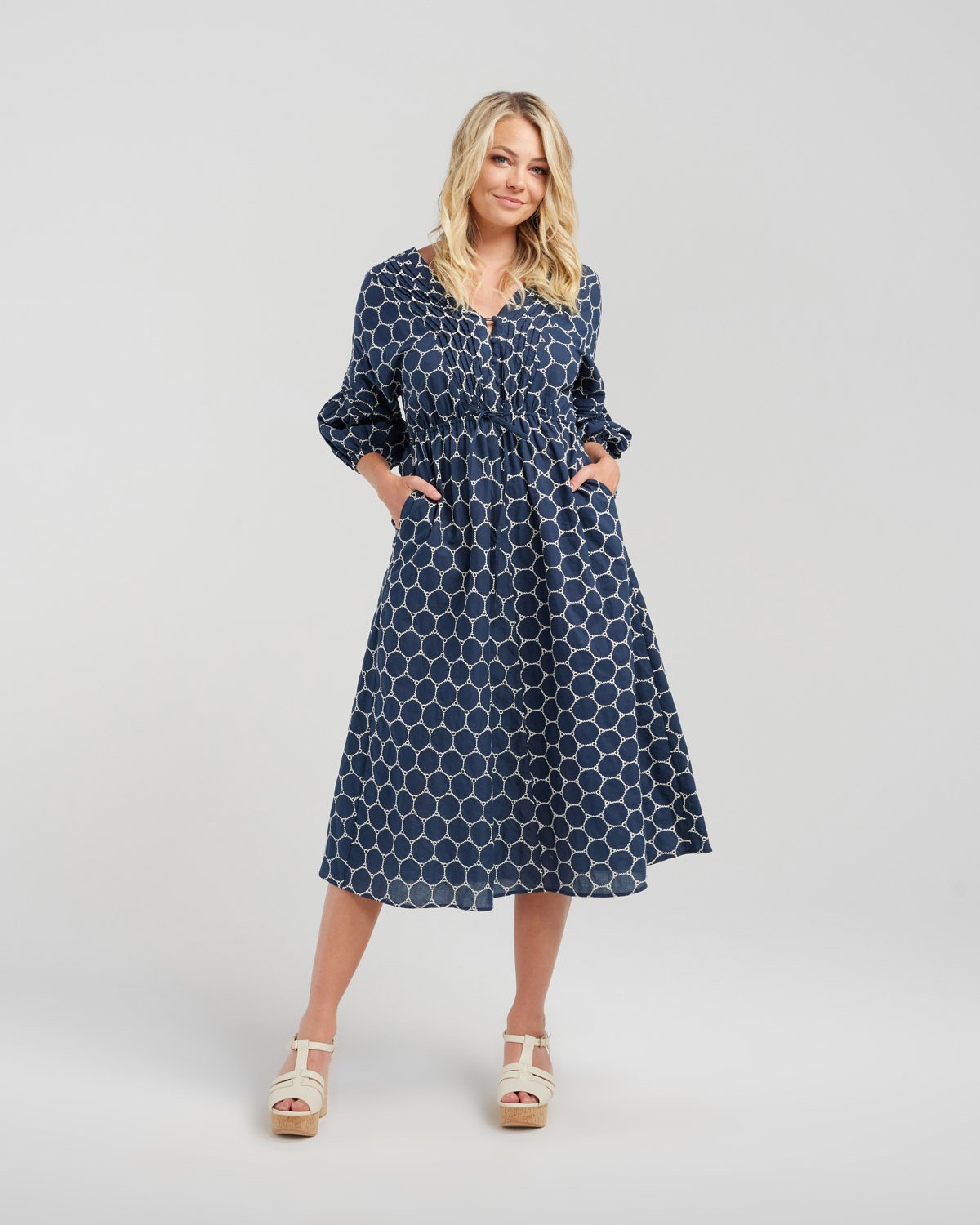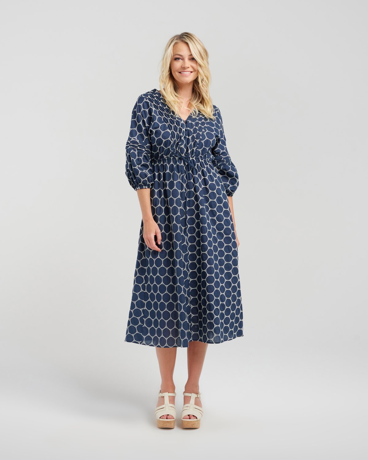 A below knee-length dress crafted from funky patterned fabric, featuring below elbow-length elasticated sleeves and a loophole button bodice.