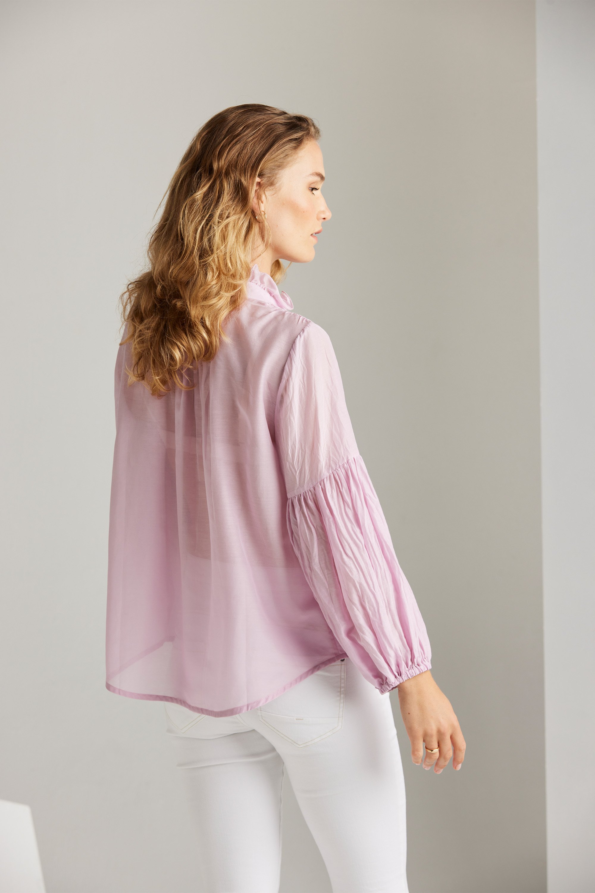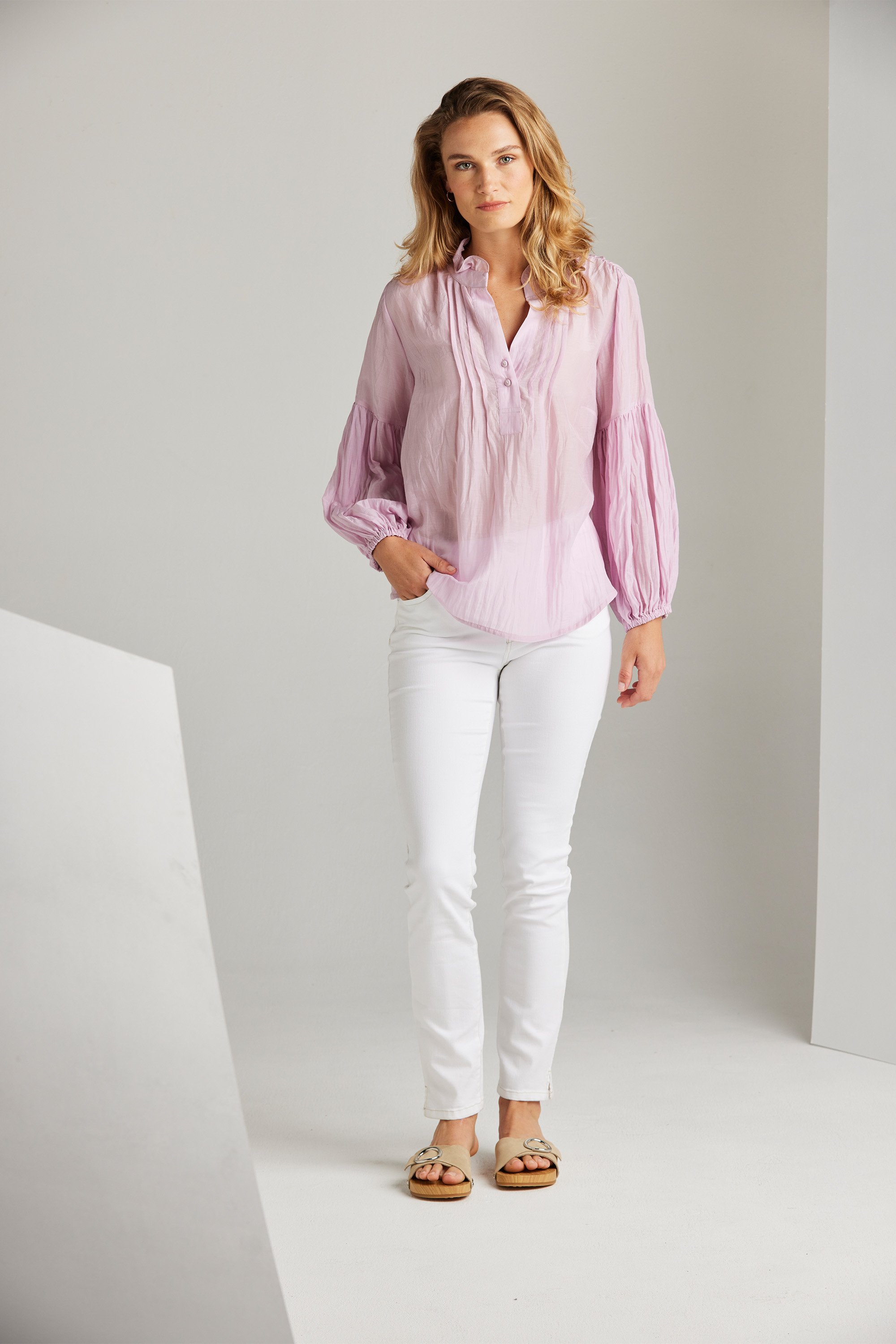 The Pia Shirt features a soft neckline with frill detail and a centre front placket with pretty self-covered buttons adorned with dragonfly metal detail. The delicate pleats along the bodice create a relaxed silhouette and the gathered blouson sleeves lend a feminine edge to this practical yet beautiful piece. Crafted in a soft silk-cotton blend the Pia is the perfect partner for denim and to herald the season ahead.