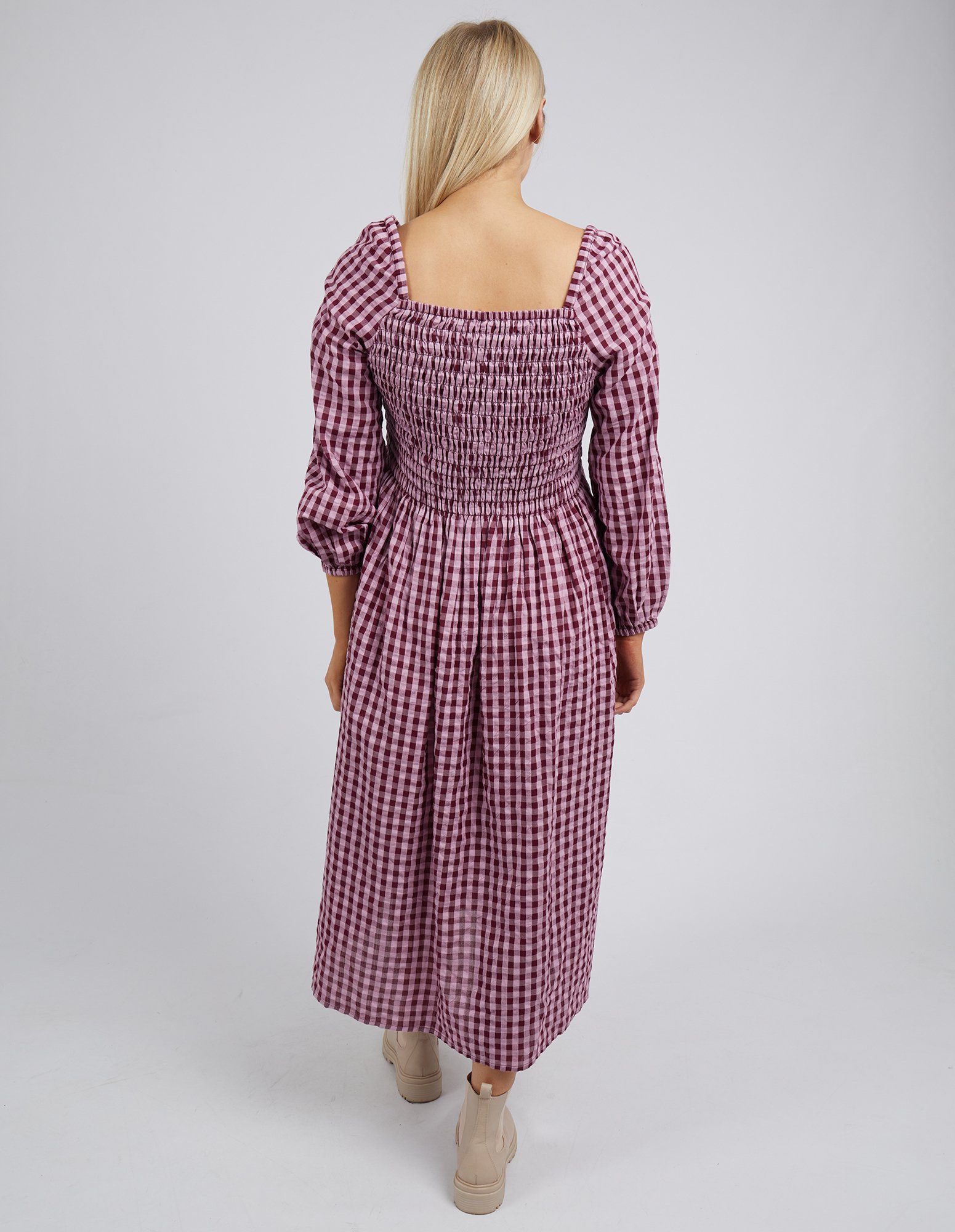 Stunning Seersucker dress with shirred bodice and square neckline.  Featuring rich plum wine coloured check, long elasticated wrist sleeves and side pockets.
