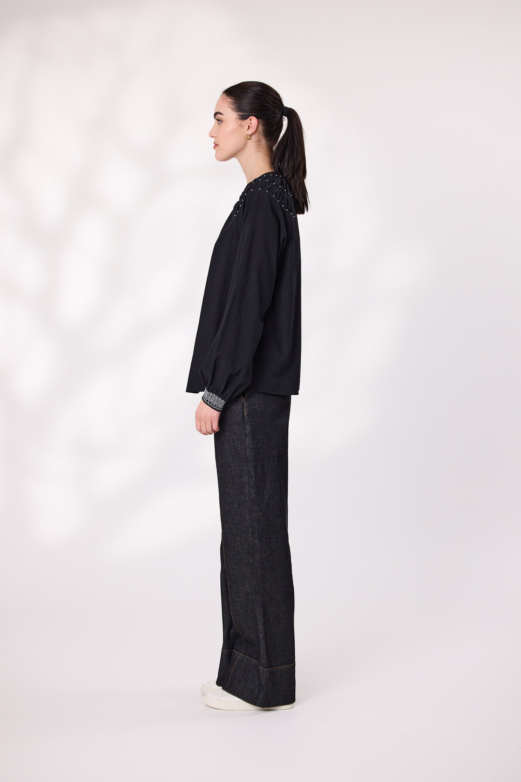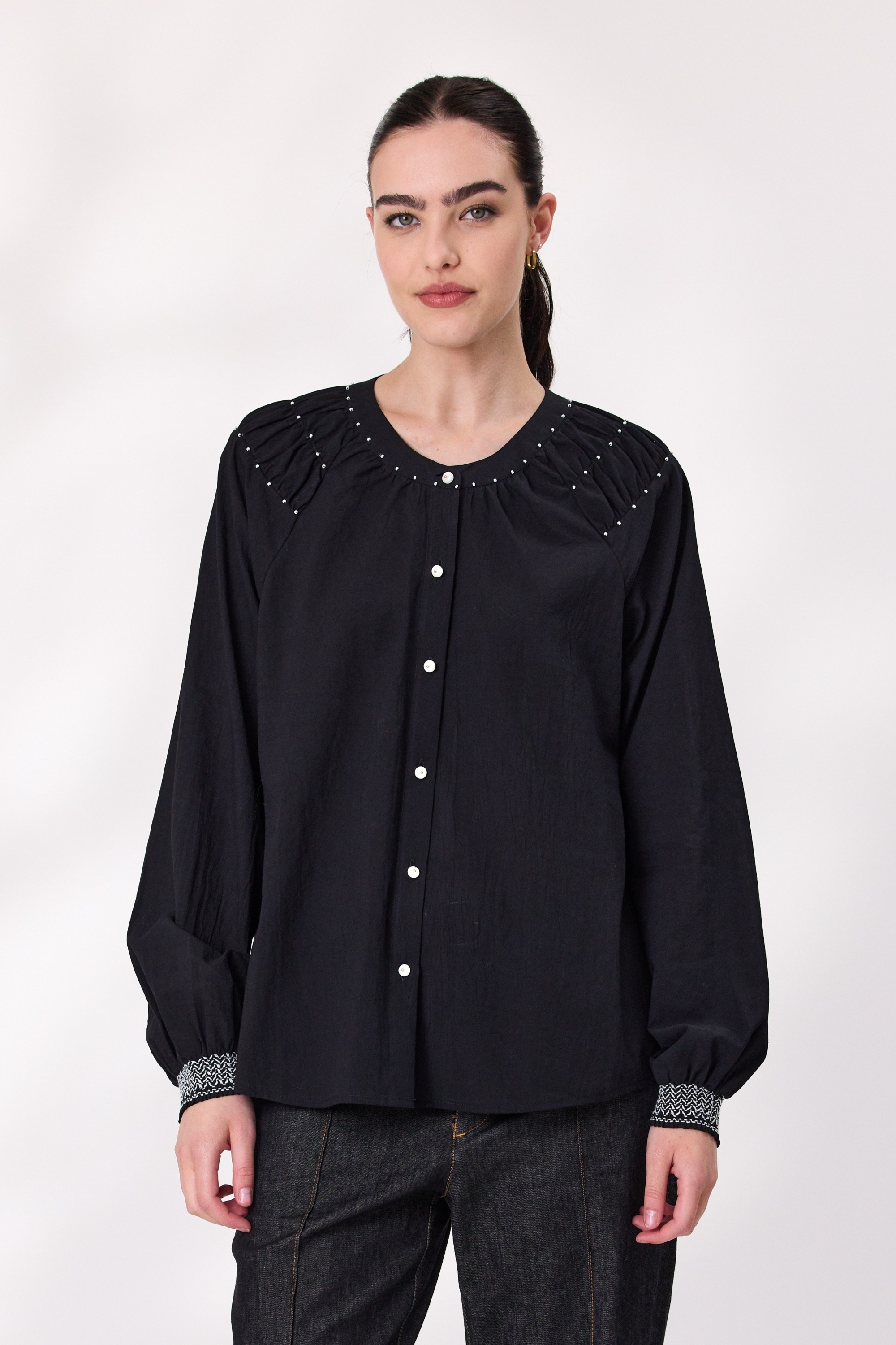 Elevate your wardrobe with this elegant long sleeve shirt, designed to blend timeless tailoring with artisanal detail. Crafted from a soft, breathable fabric, it features a classic button-down front for versatile styling and delicate beads embellishments. Lovely shirring at  sleeves cuffs that add visual interest.