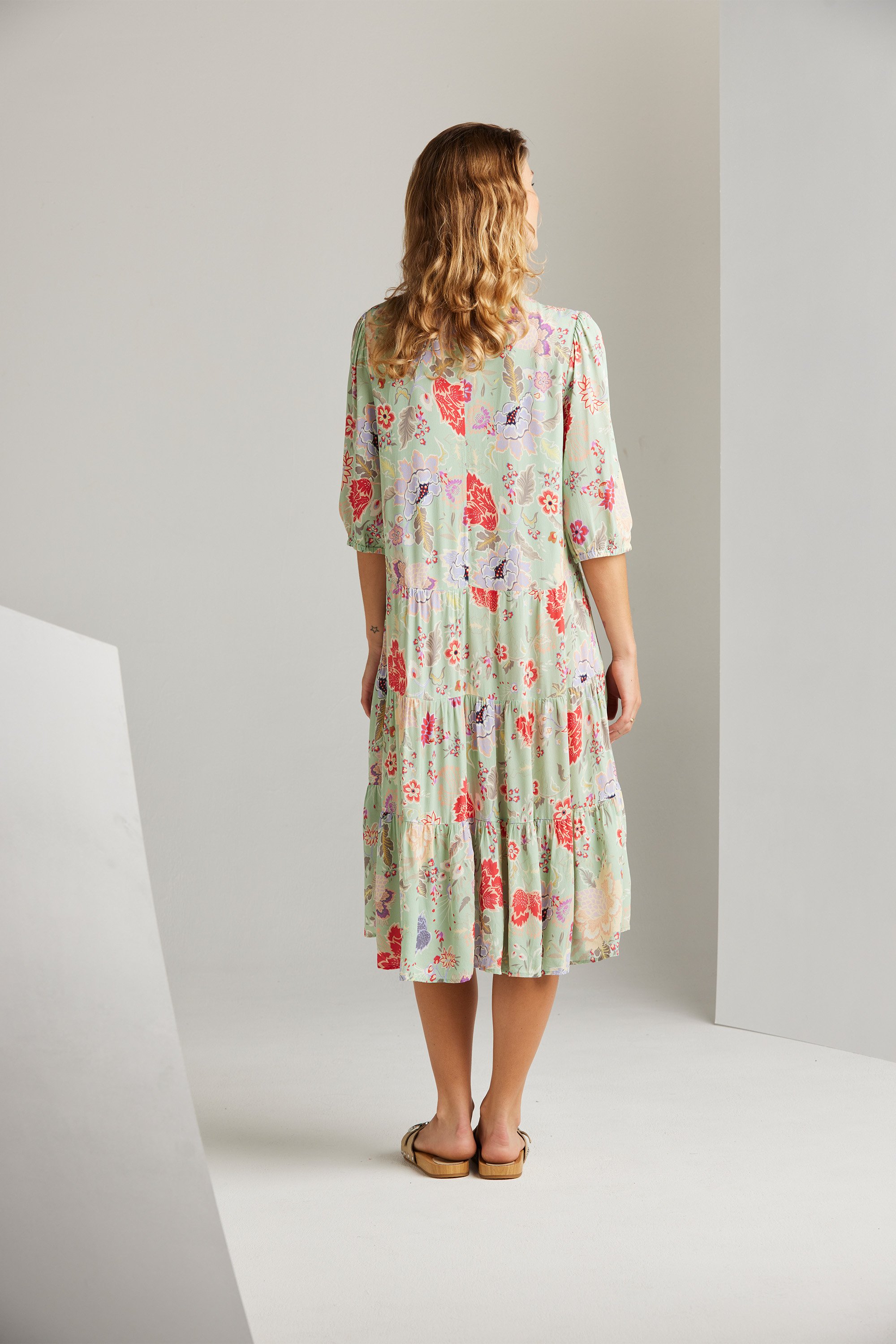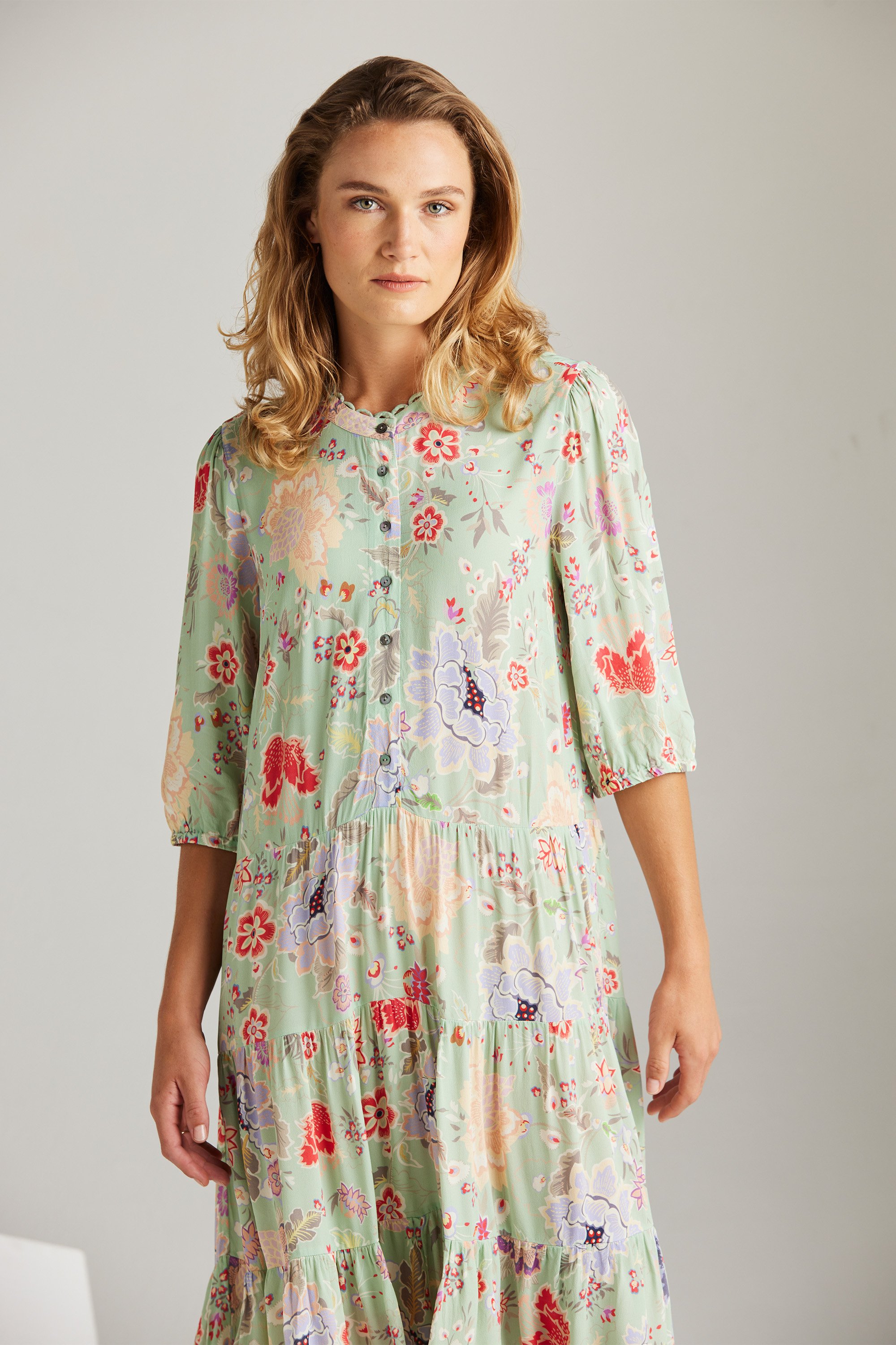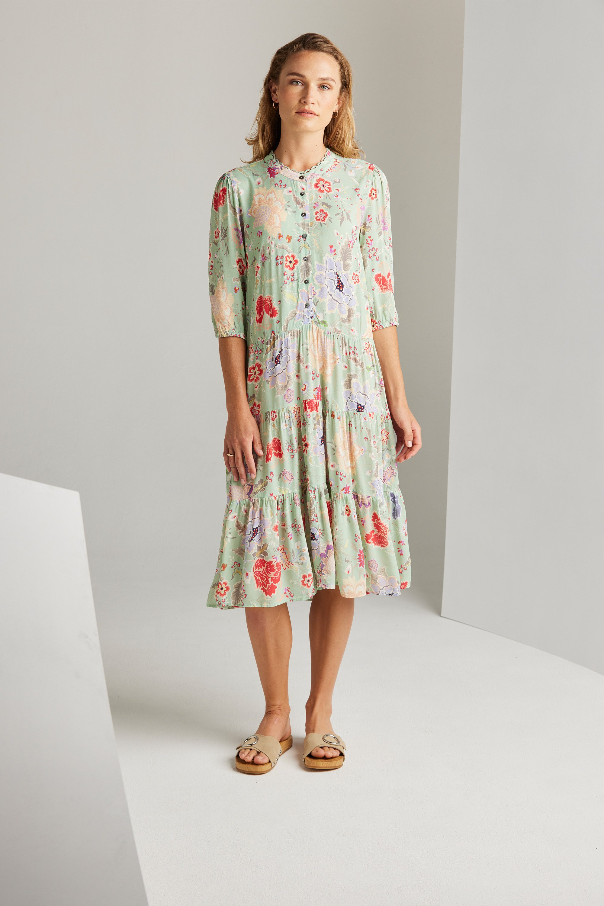 The Regent Dress is an elevated style featuring a delicate and feminine floral print, a lightly gathered tiered skirt, and a centre front placket embellished by smoke shell buttons. The collar stand with delicate rouleau loops is the epitome of femininity.