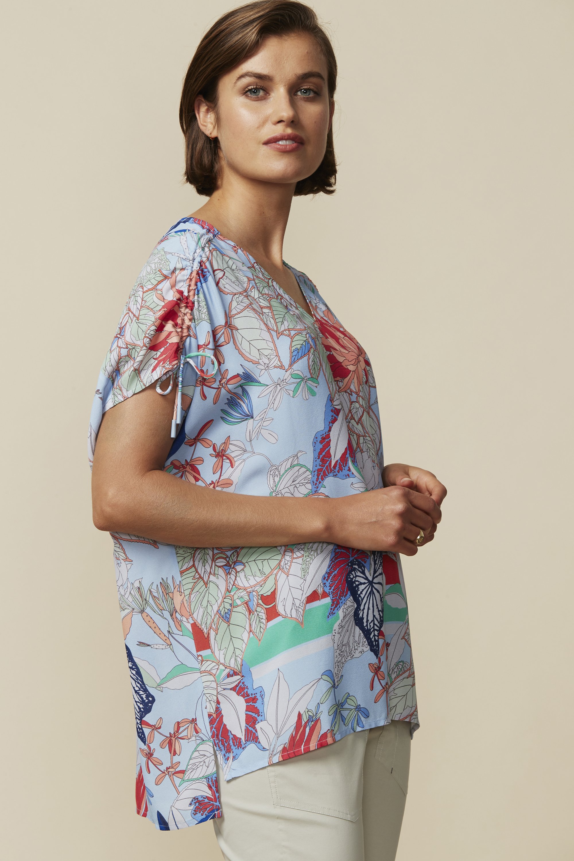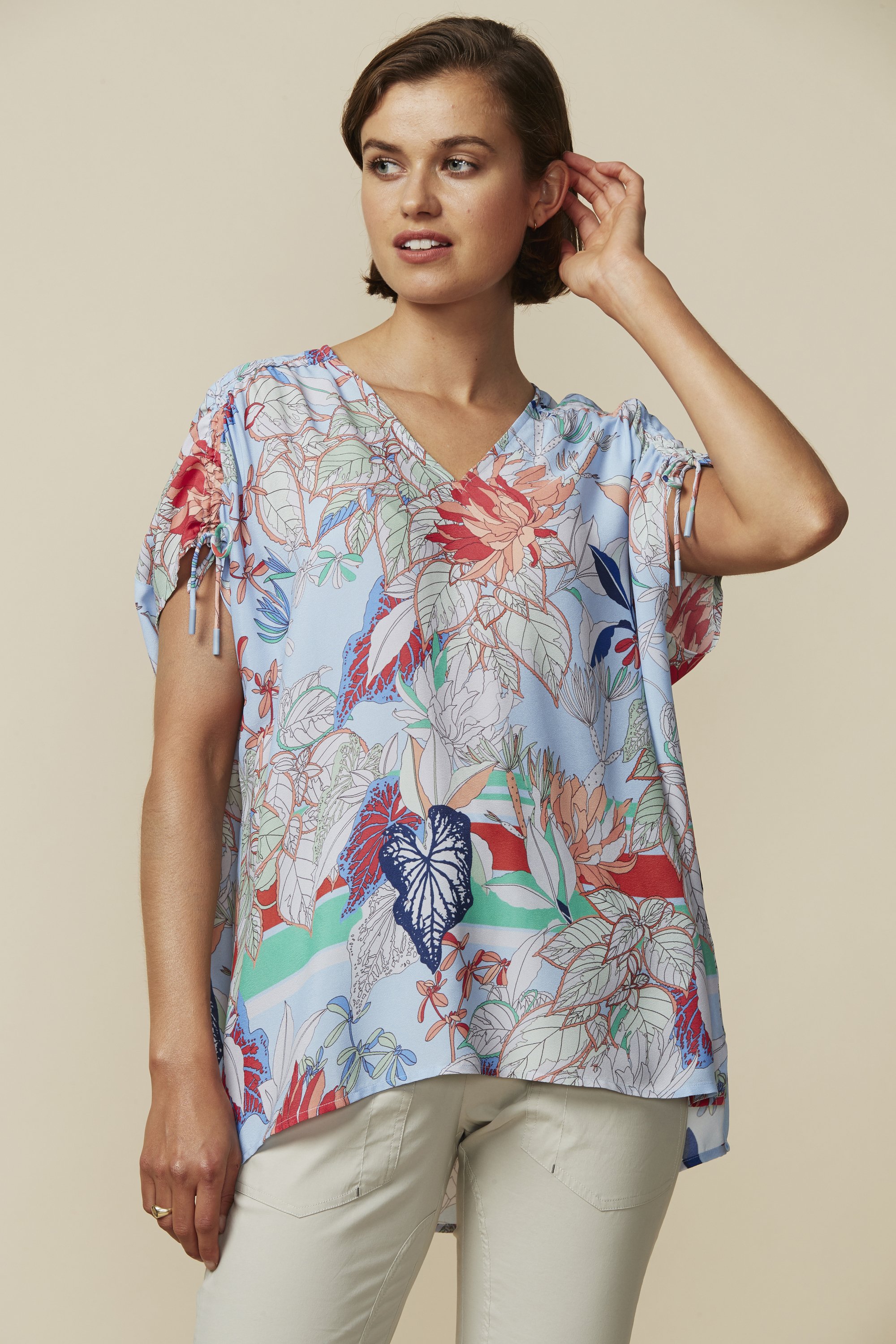 Capture the summer rhythm in our Rhythm Top, an easy fit short sleeve top with V-neck and high low hem; featuring adjustable drawstring detail at the shoulders.