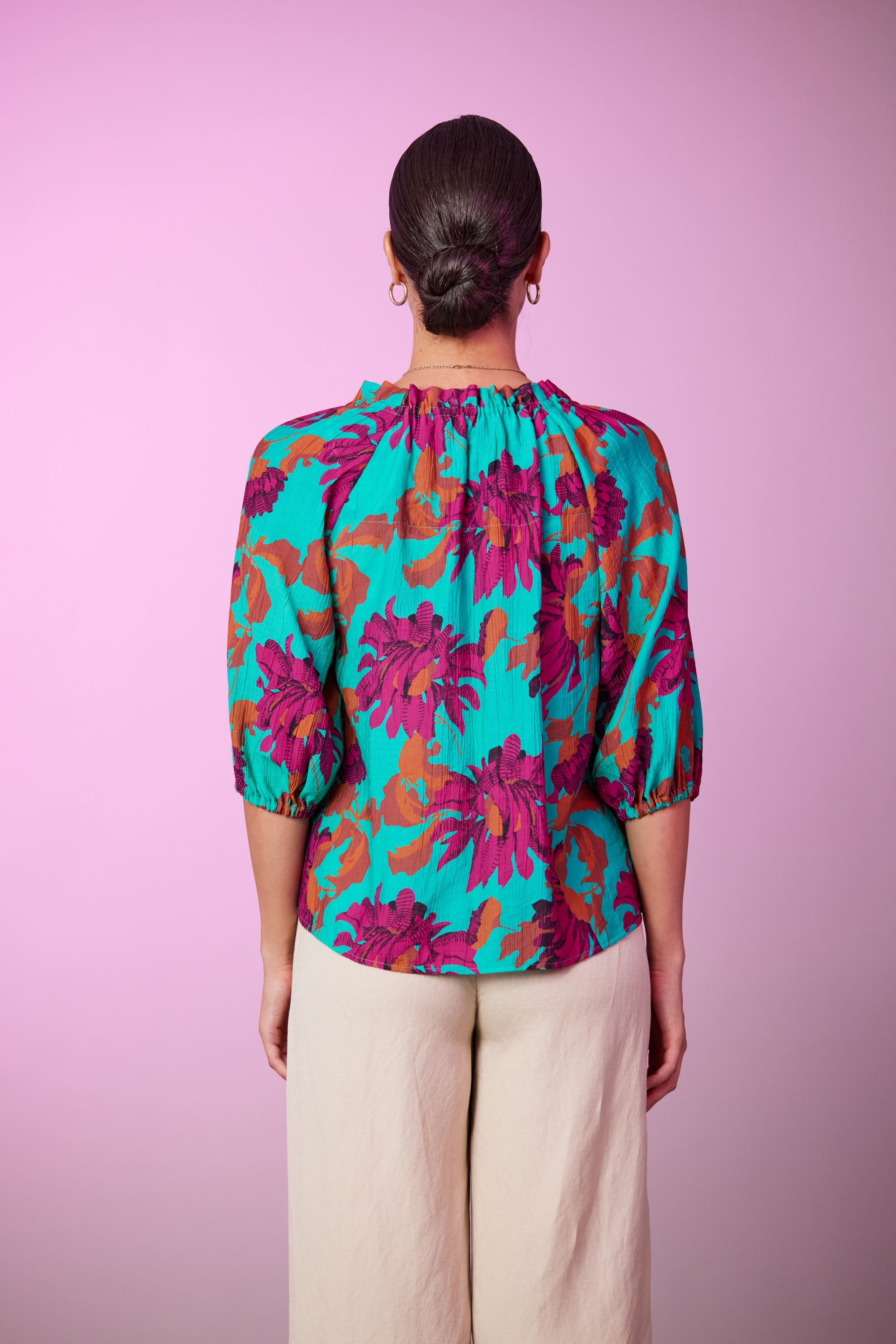 This elegant blouse features a frill neck and raglan armholes, giving it a sophisticated and stylish look. The elbow-length sleeves with elasticated cuffs adds a touch of comfort to the design. Made from a textured Viscose Nylon blend fabric, this blouse is perfect for both casual and formal occasions.