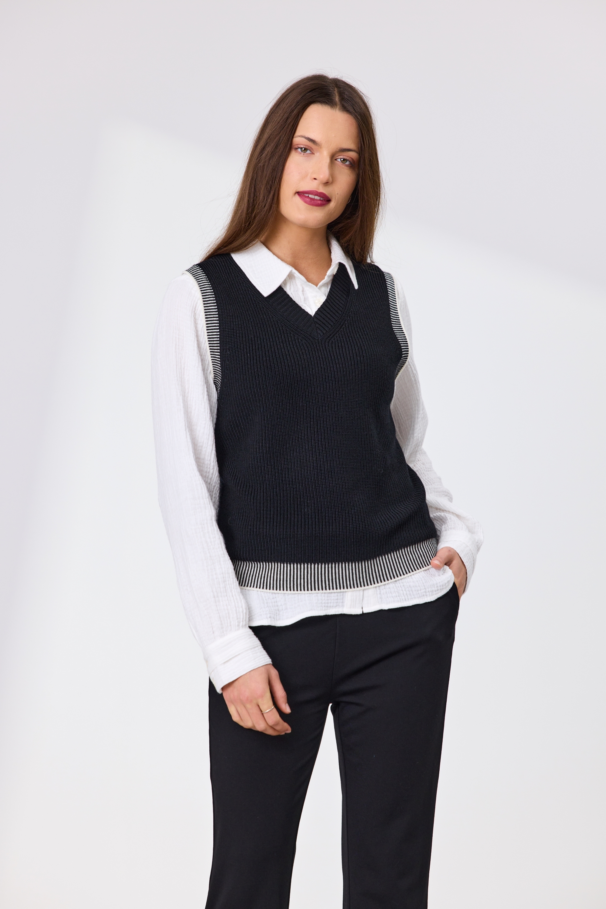 This 100% Merino wool vest is a versatile layering essential with elevated detailing. Featuring a two-tone rib finish around the armholes and hem, it adds a subtle contrast that enhances its modern appeal. Side splits offer ease of movement and a relaxed fit, while the classic V-neckline makes it perfect for pairing over shirts.