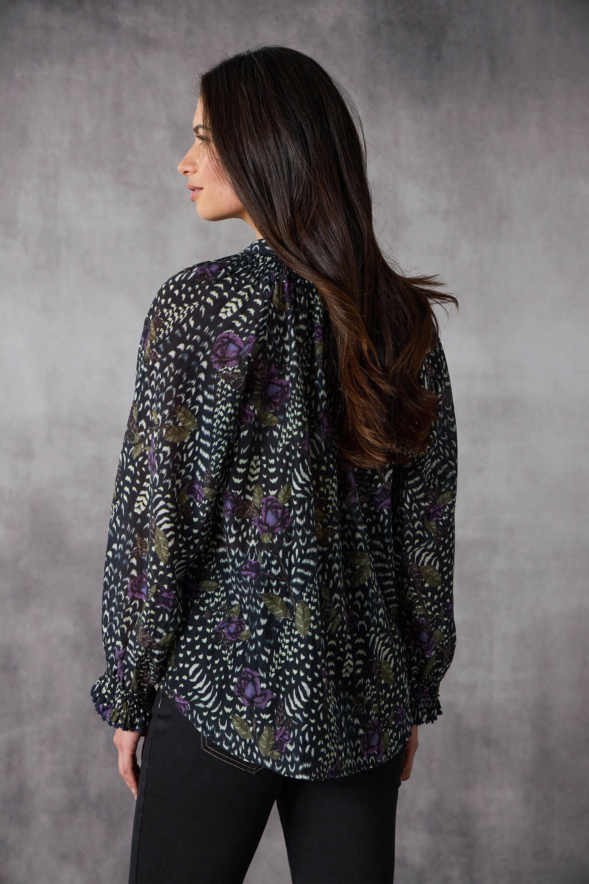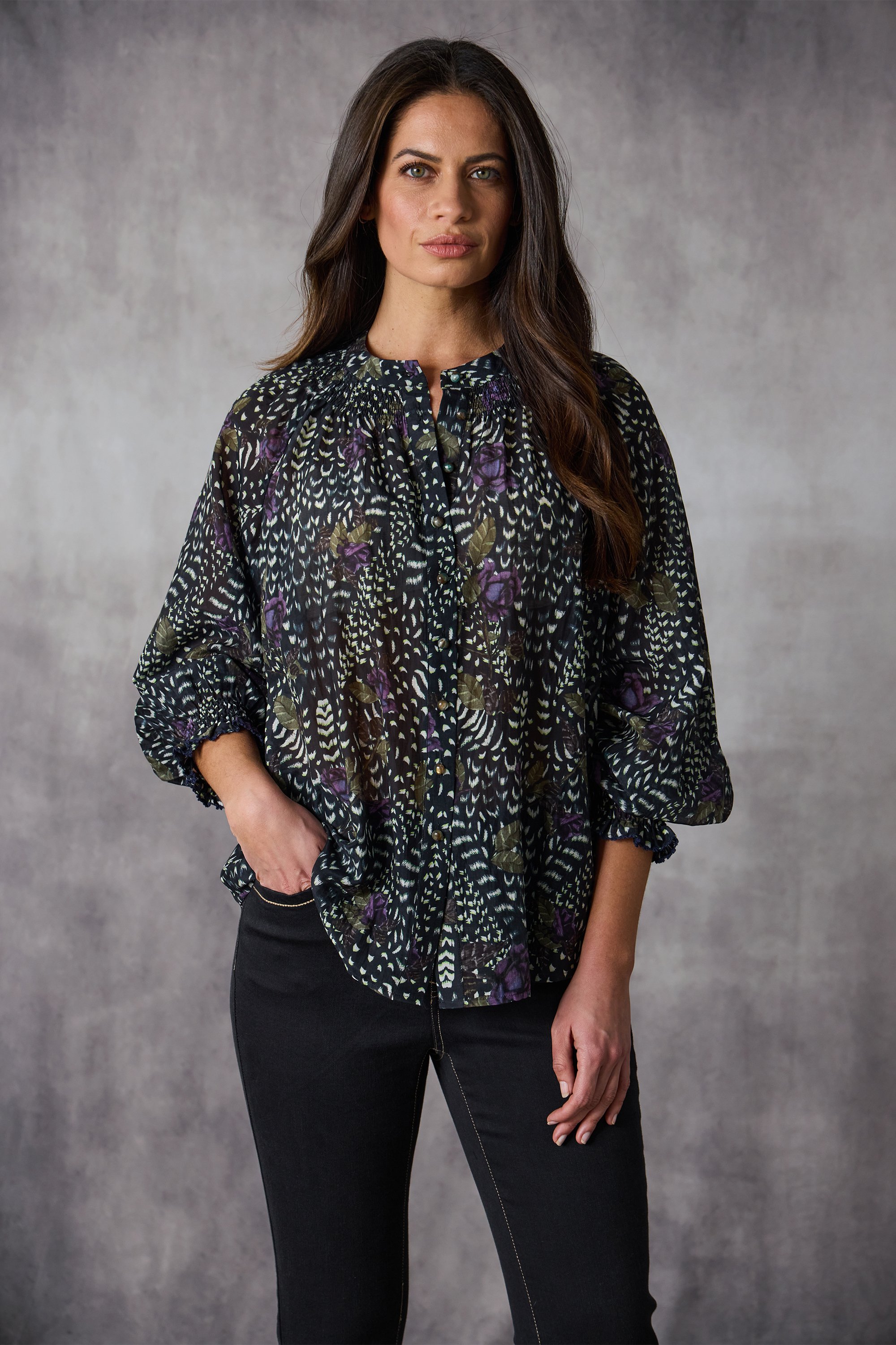 Embrace laid-back elegance with the Santiago Shirt, a relaxed fit floral printed Silk Cotton featuring button-though shirt with tonal dome glass butons, shirred neckline, and contrast embroidery detailing on the shirred cuff. The detailing adds a feminine touch as well as allowing the print standout.