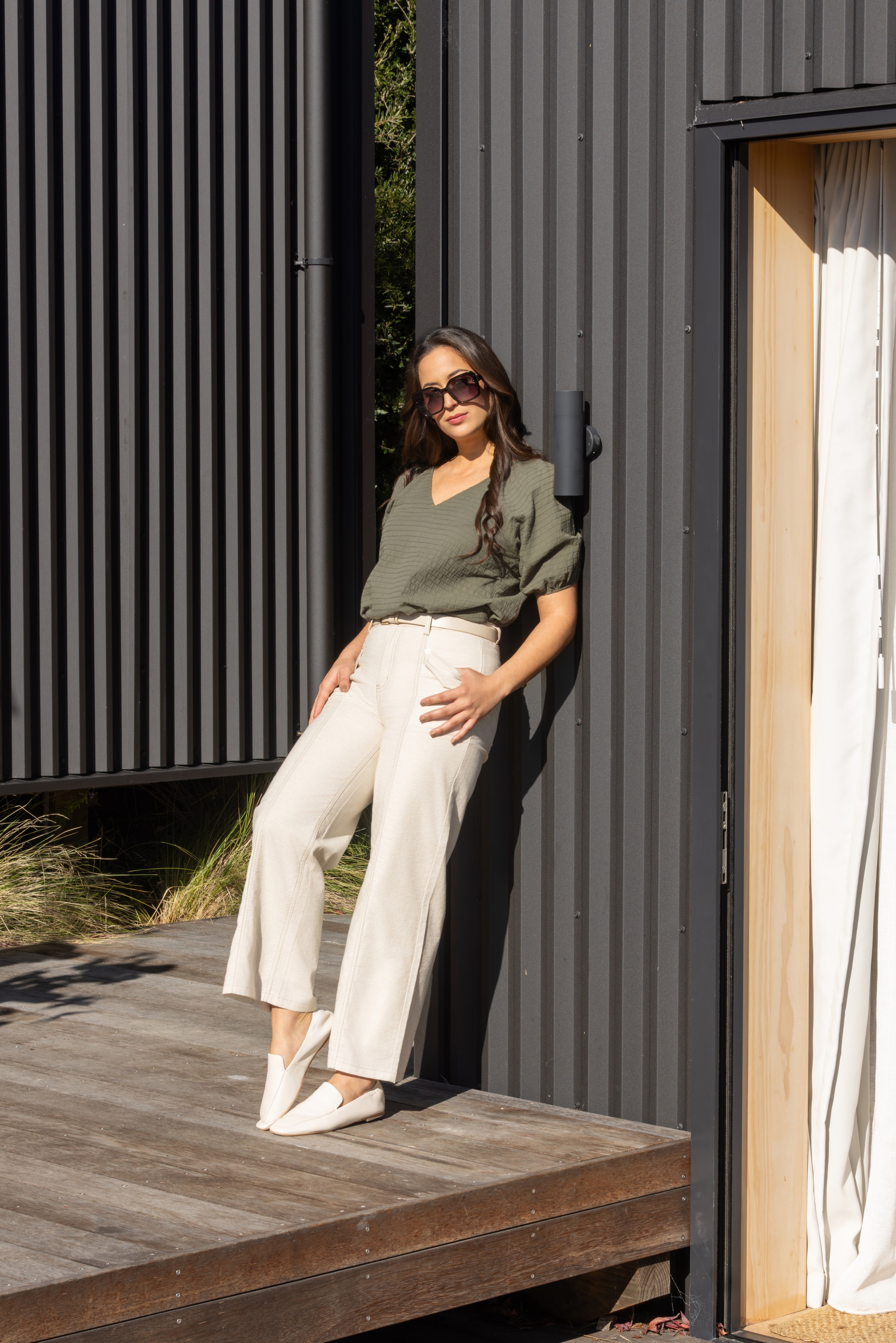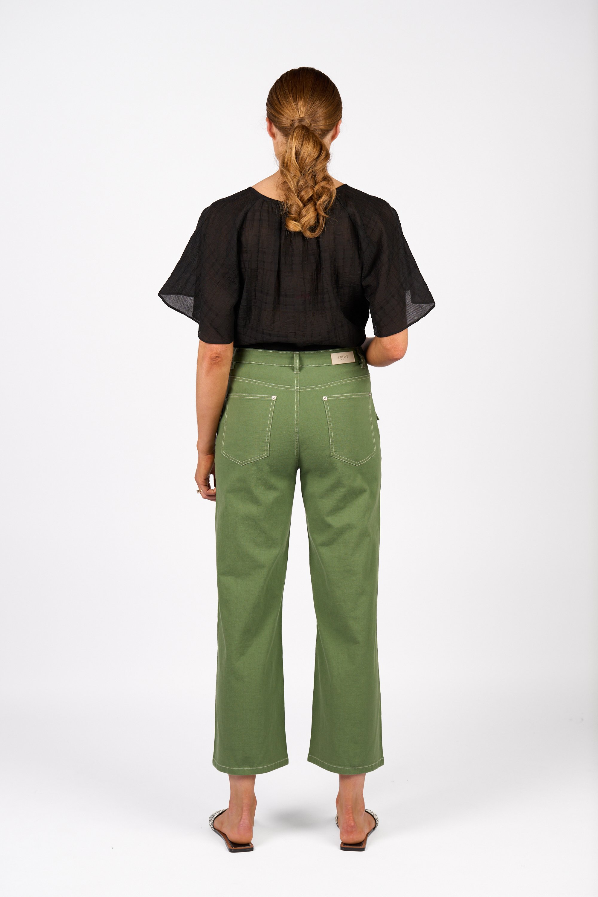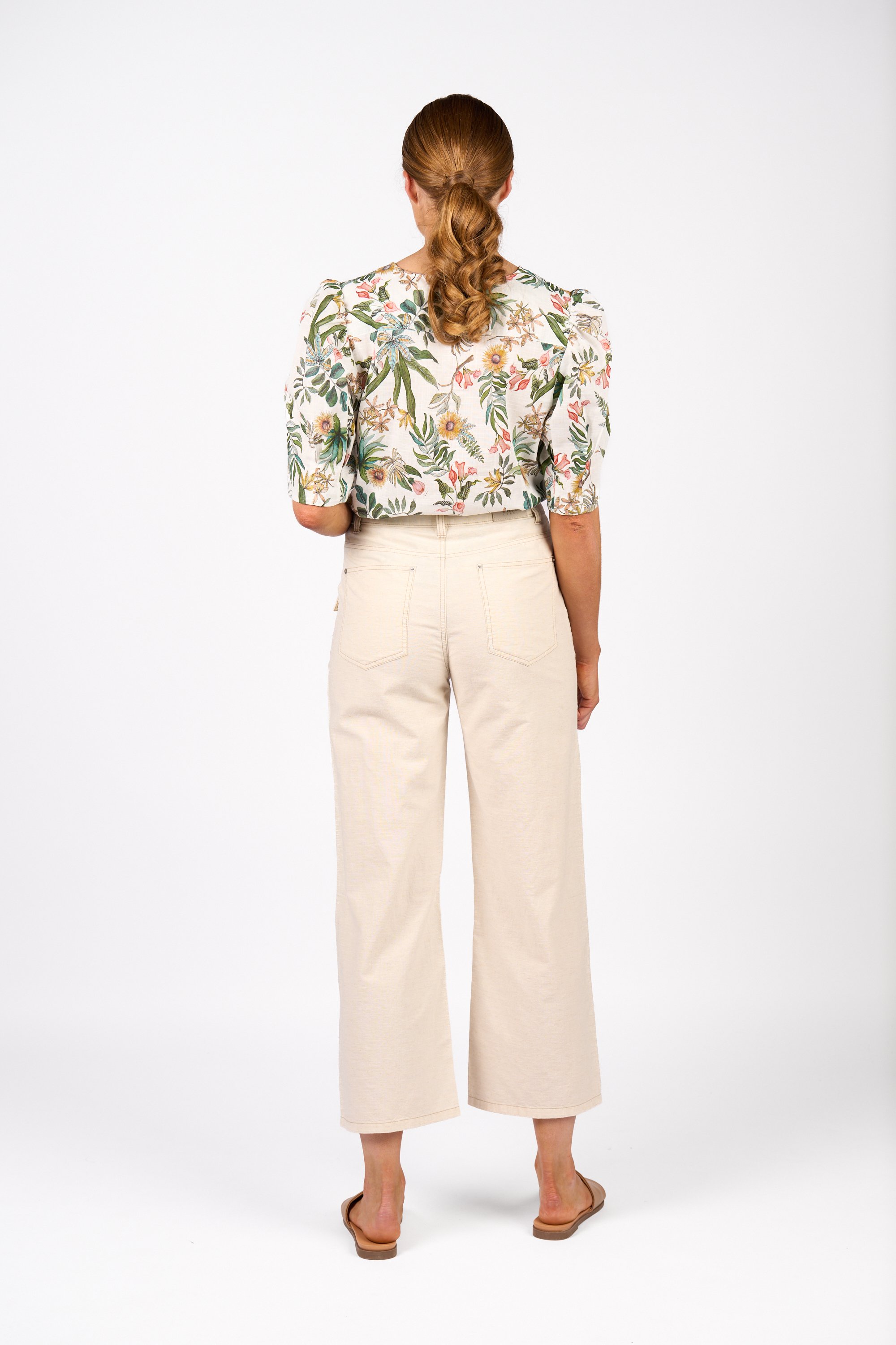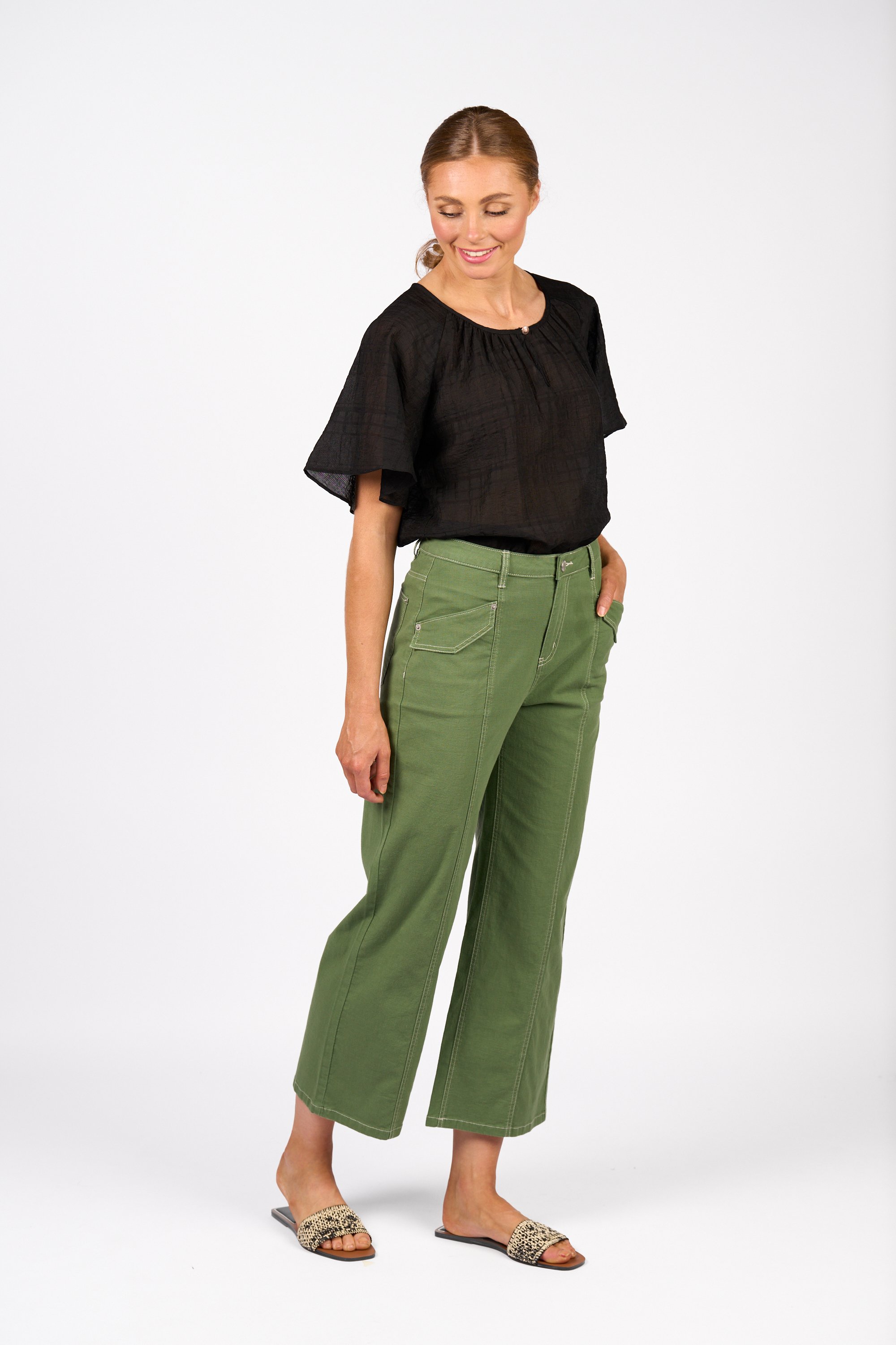 The Shade Pant is made from a breathable natural blend with contrast stitching throughout. A centre front seam runs cleanly down each leg, and flap patch pockets add a utility-inspired touch. The wide leg, ankle-grazing cut is finished with a zip fly and belt loops for a polished yet relaxed look.