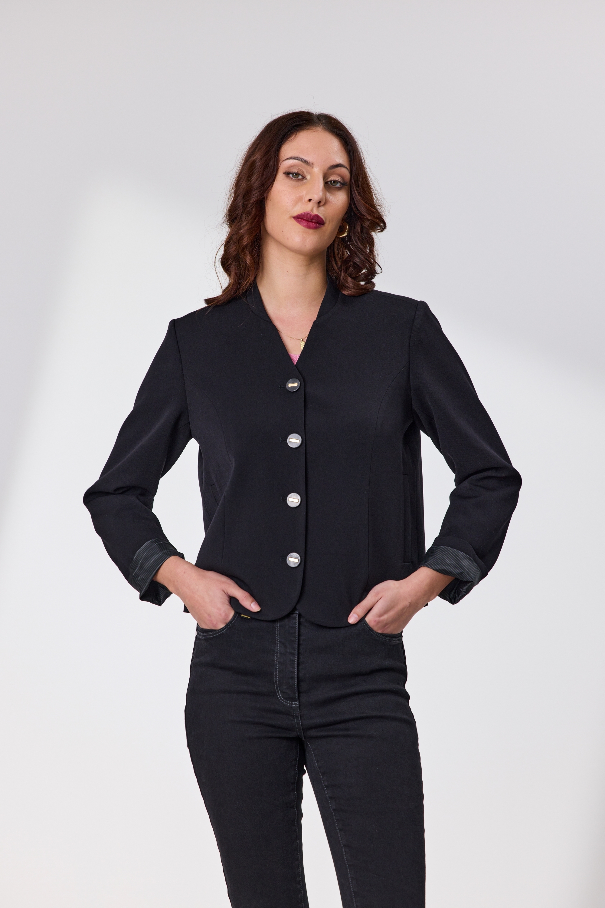 This fully lined cropped blazer is a modern wardrobe essential, featuring a tapered mandarin collar and clean button-front closure. Designed with a curved front hem and functional pockets, it blends structure with subtle flair. The sleeve cuffs reveal a striped lining when rolled up, adding a playful contrast to the sleek exterior. Perfect for layering over both casual and dressy looks.