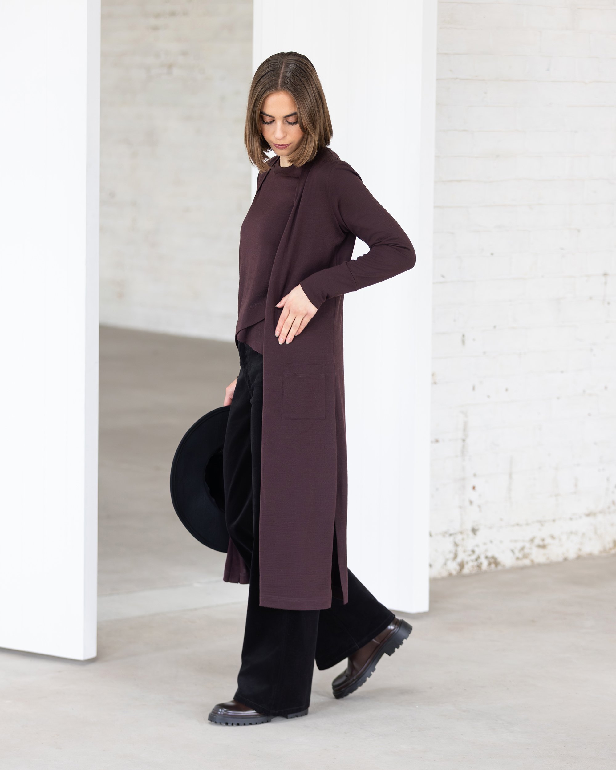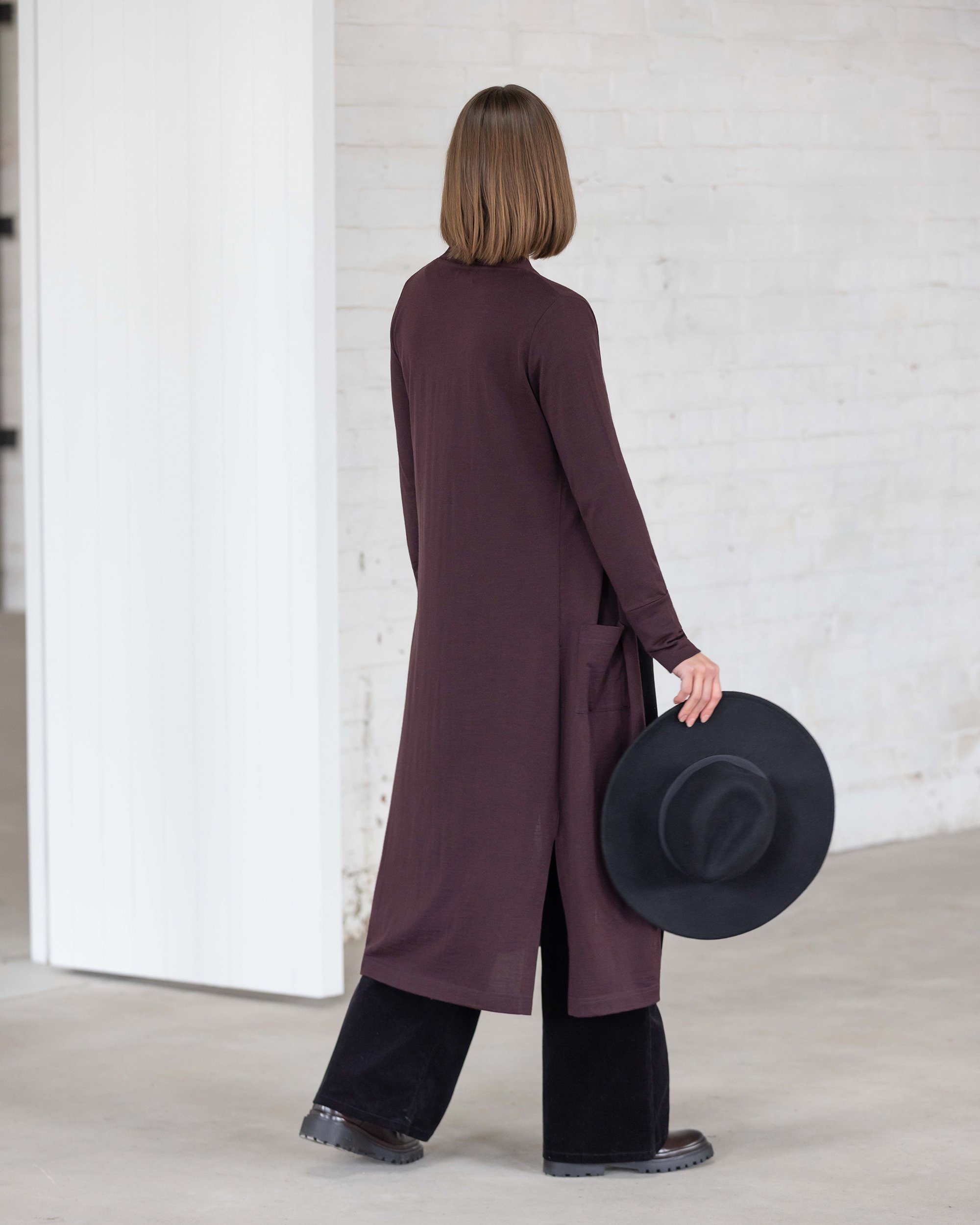 Long merino coatigan — a rich dark plum tone. Designed with an open front and a slim, streamlined fit, this style offers an easy layering piece that provides warmth without bulk.
