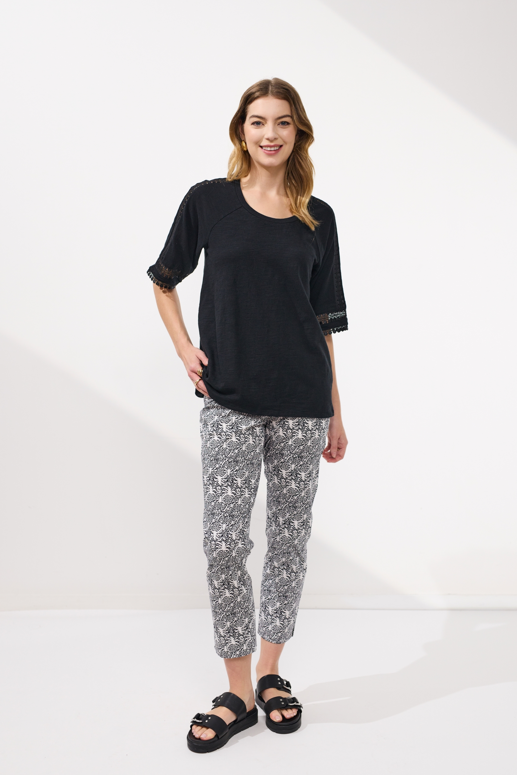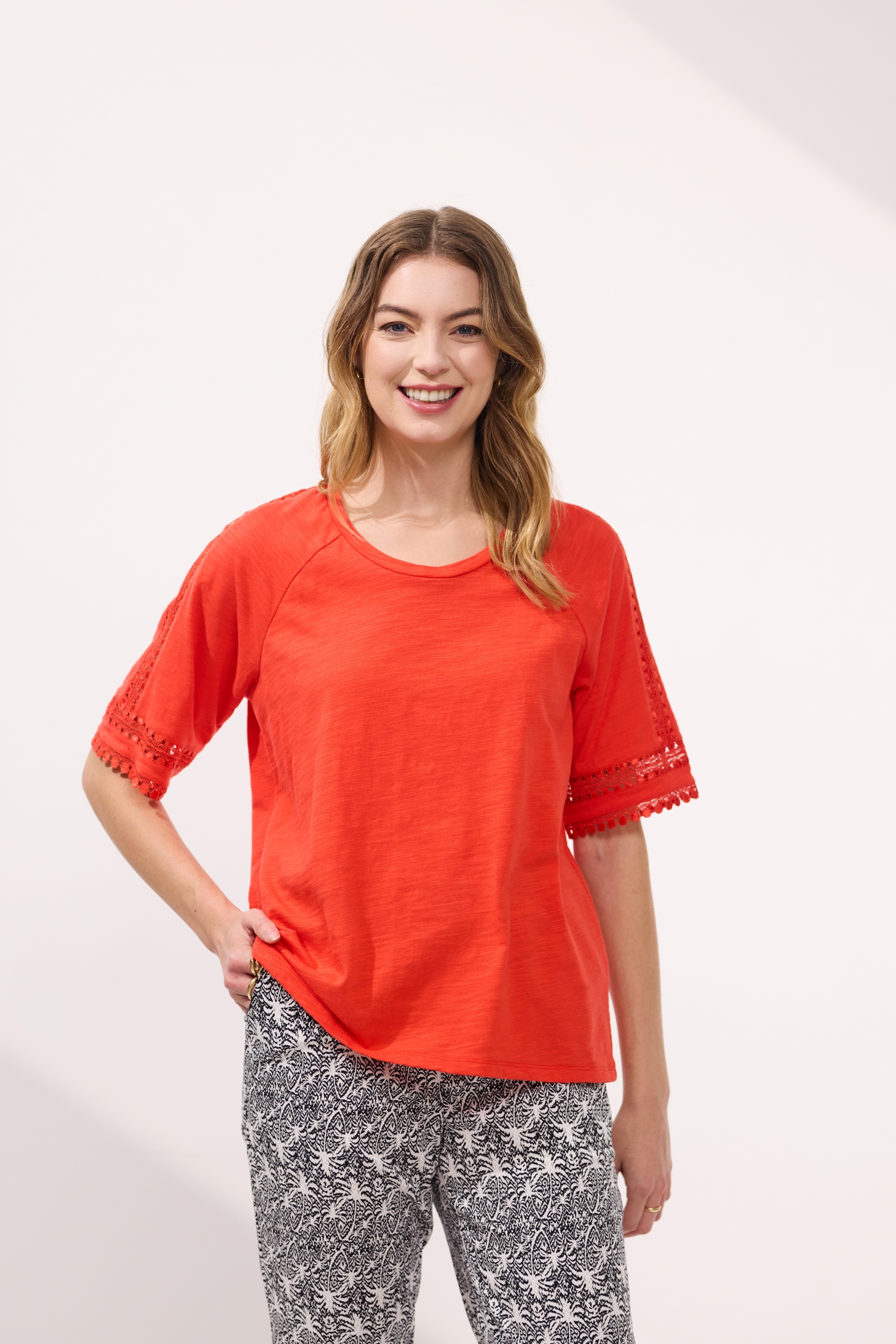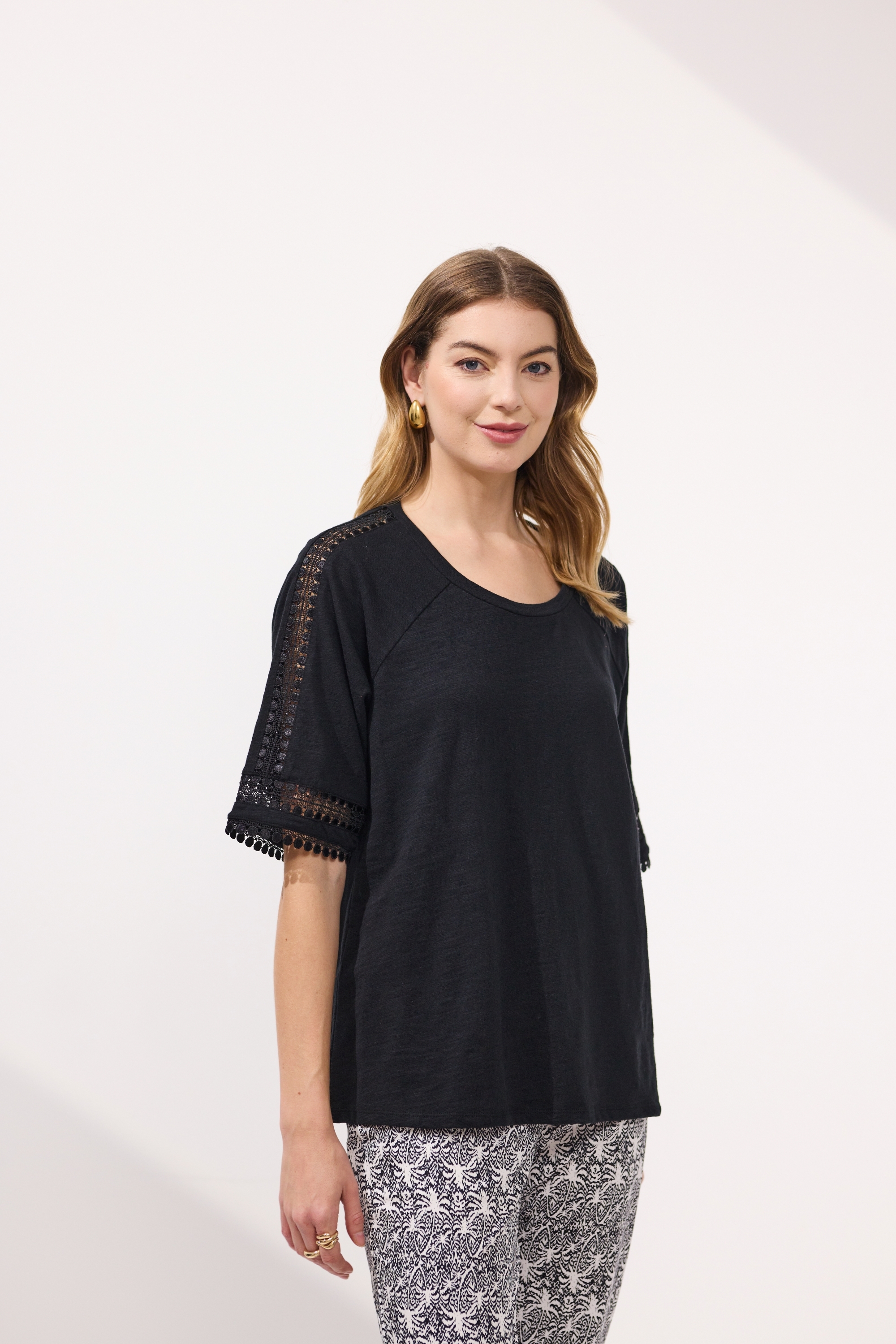Scoop neck t-shirt. Raglan armhole, short sleeves with lace tape trim detail inserted at cuff and centred vertically in sleeve.
