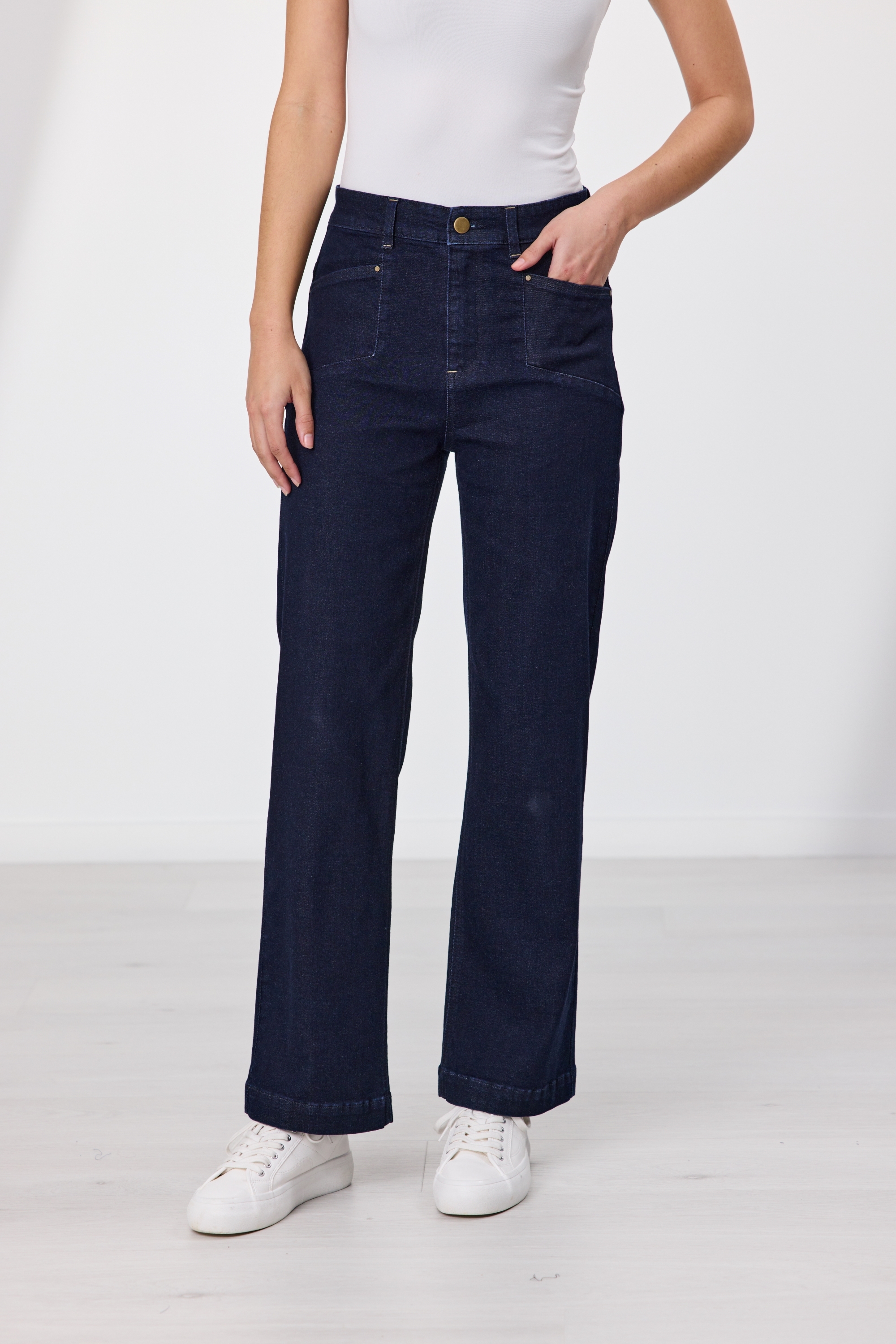 On trend, wide leg jean with four-pocket styling and shaped back yoke. Full length with a high rise waist and fly front.