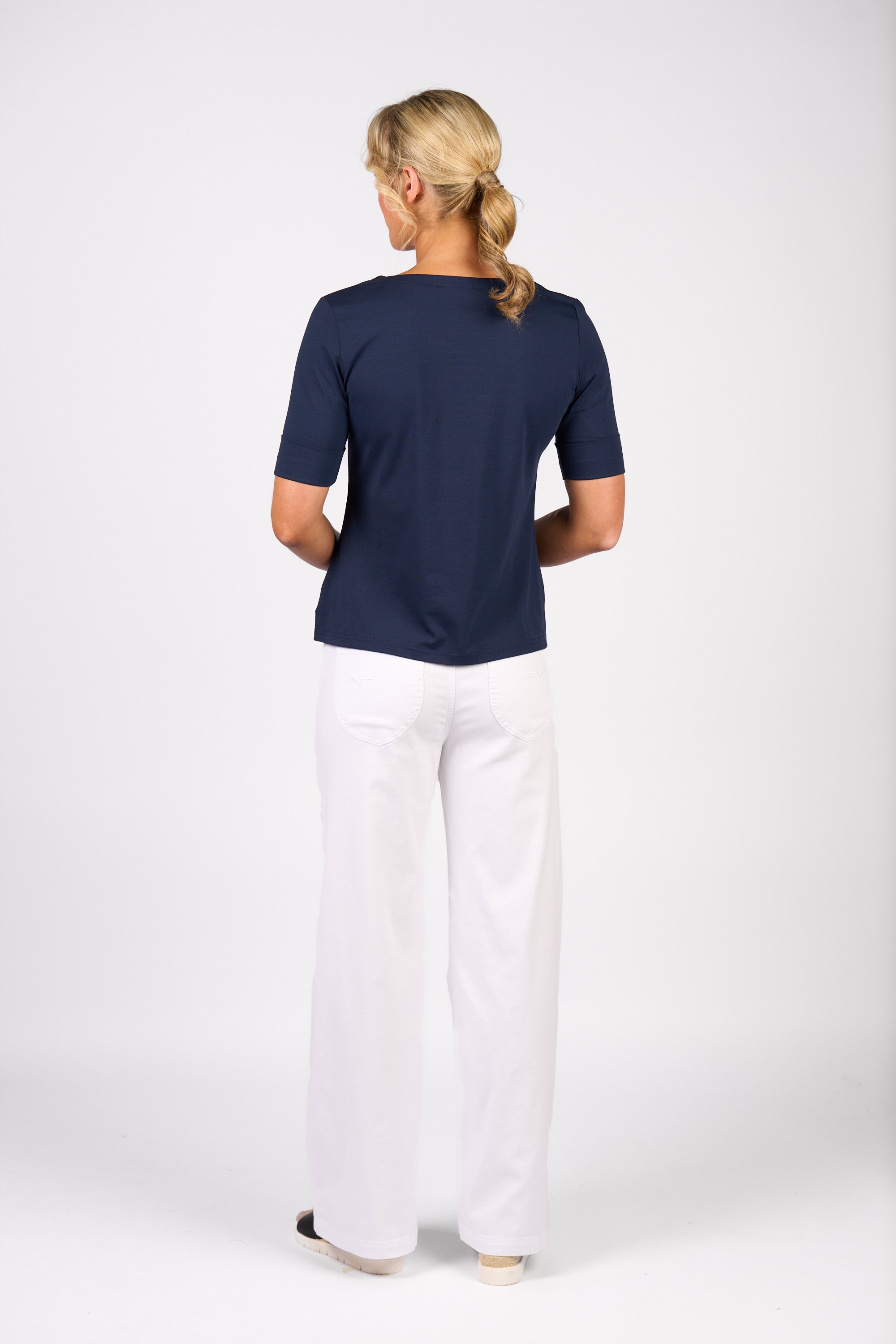 This white boat-neck top is made from soft, stretchy cotton-elastane jersey for all-day comfort. It features short sleeves with turned-up cuffs, a relaxed fit, and side splits for easy movement.