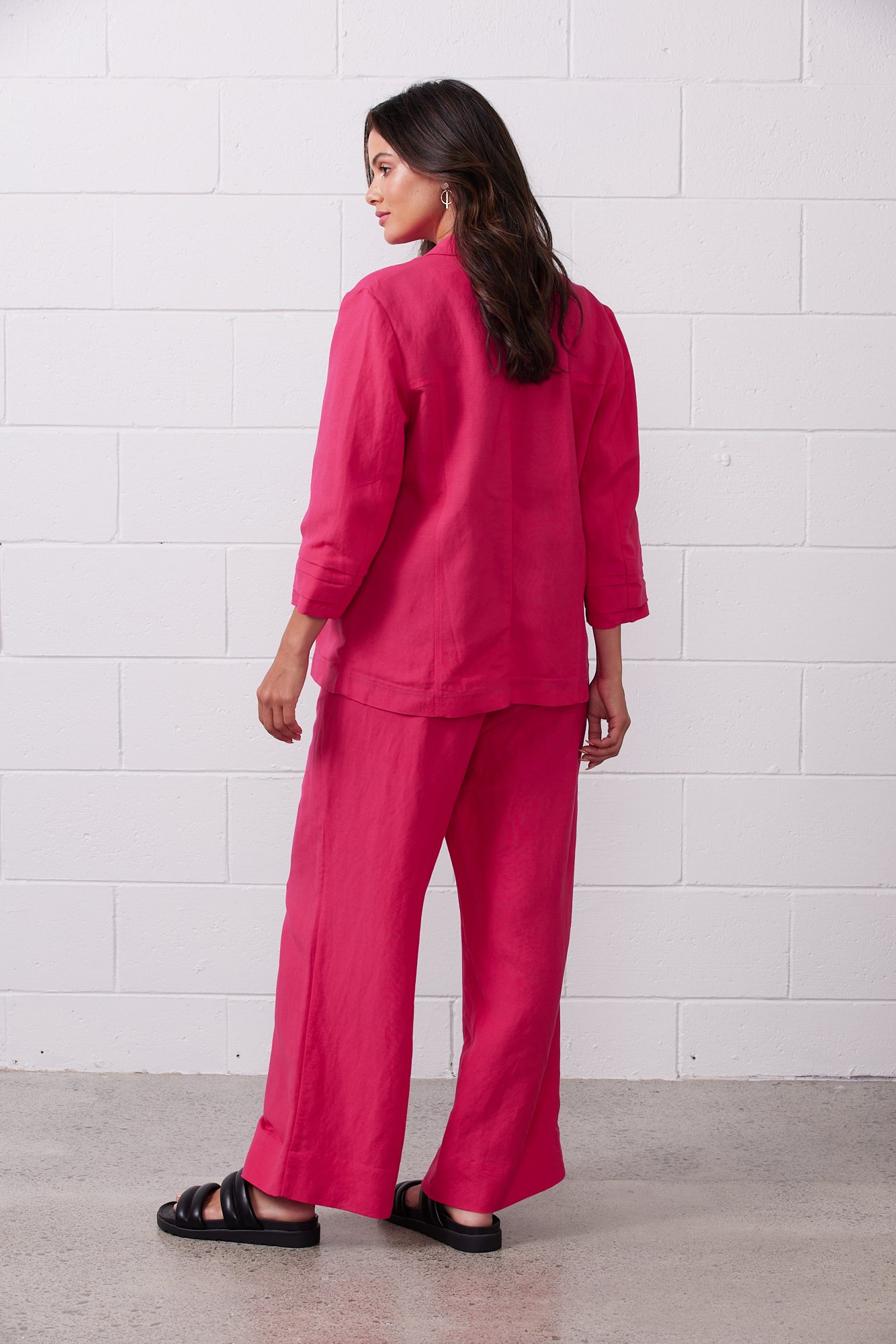 Soft linen blend blazer with a shawl collar, single button front closure and welt pockets. Three quarter sleeves are finished with pleat detailing.