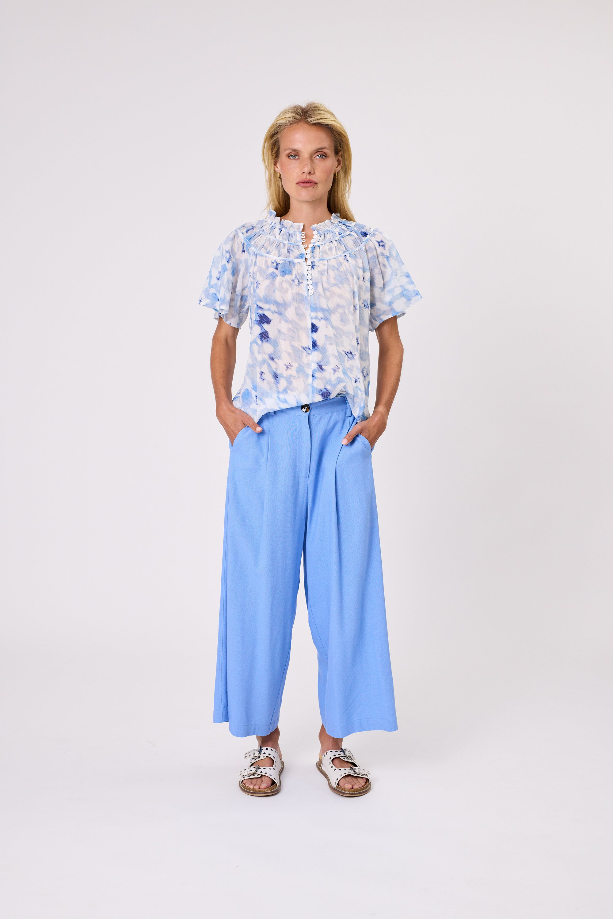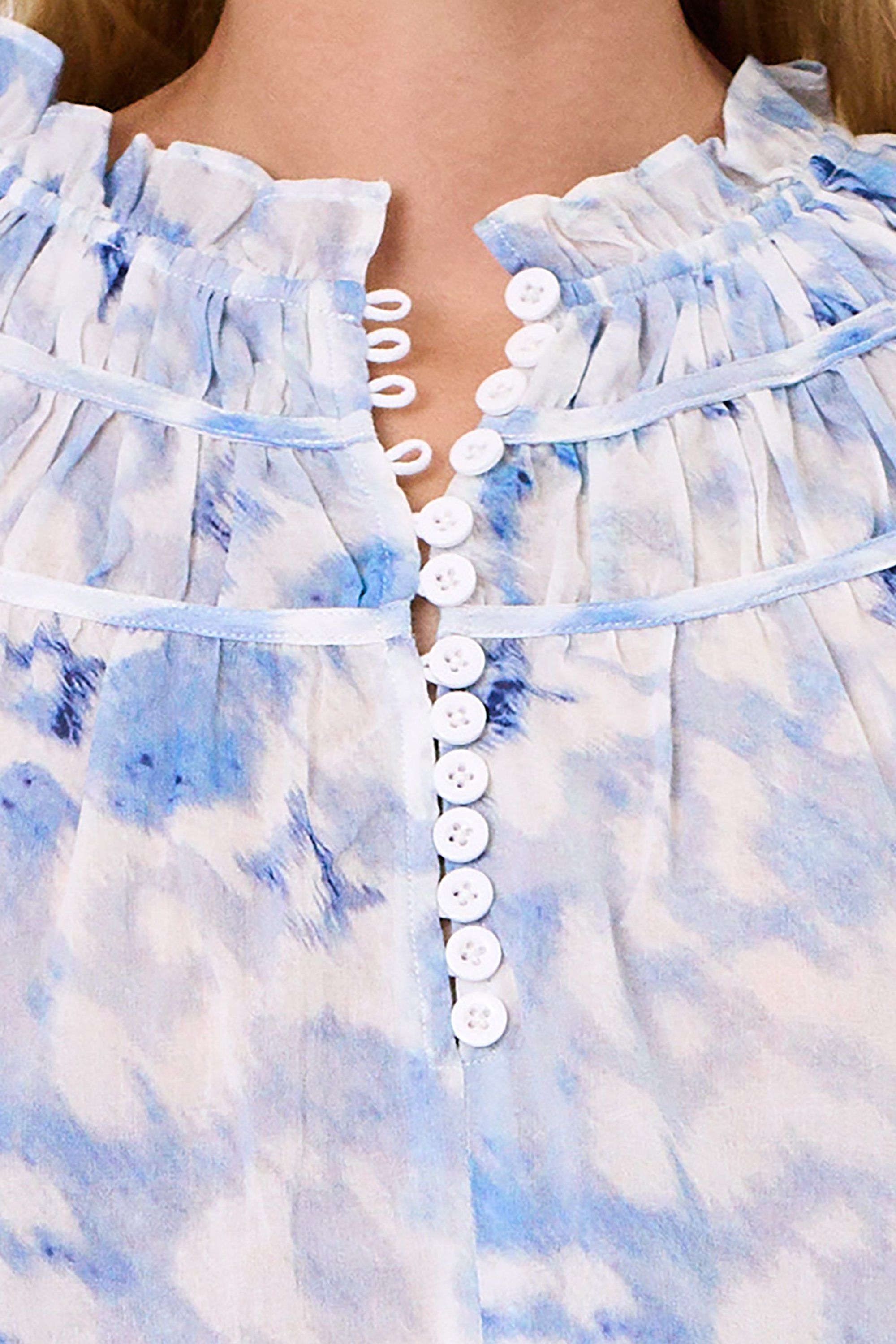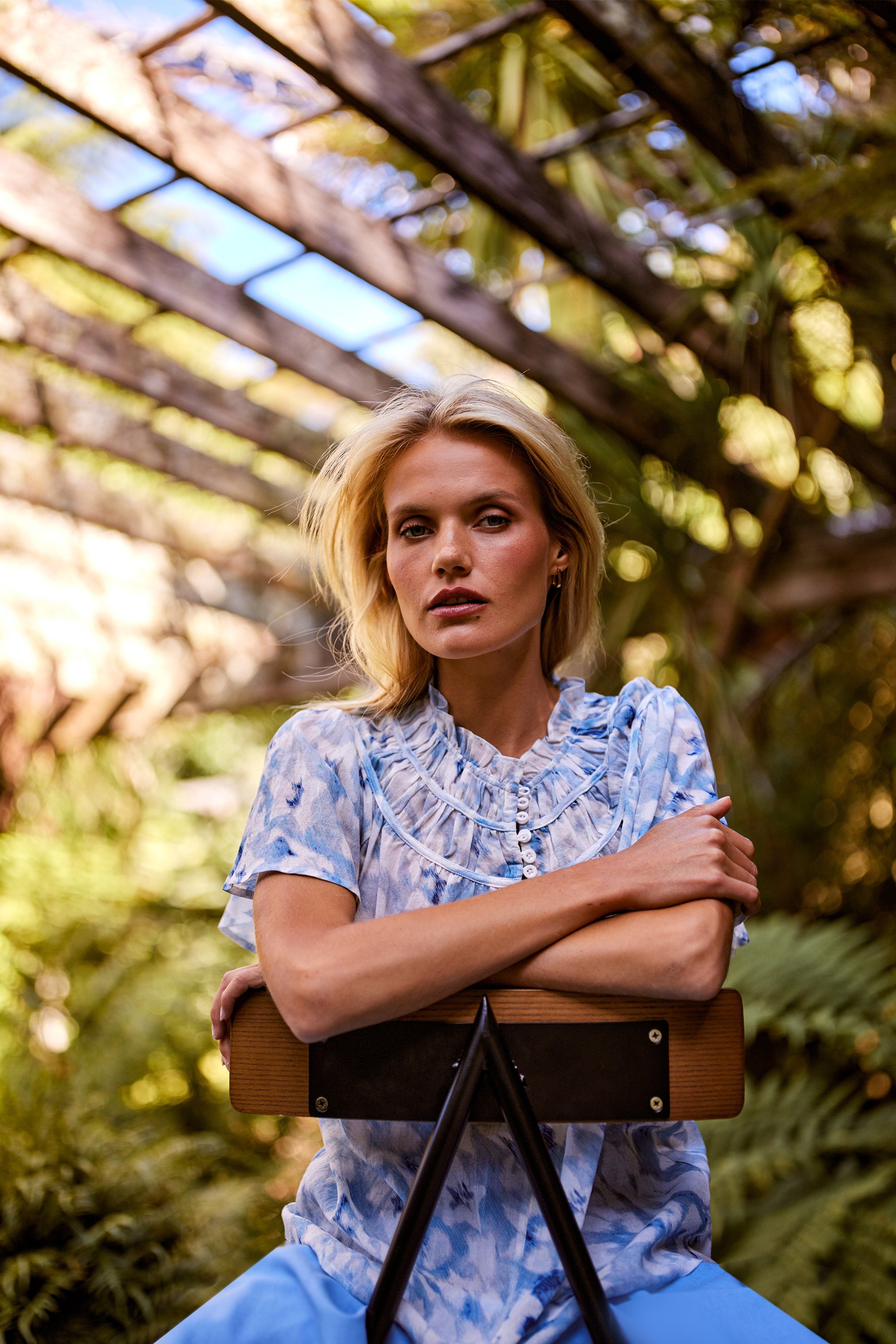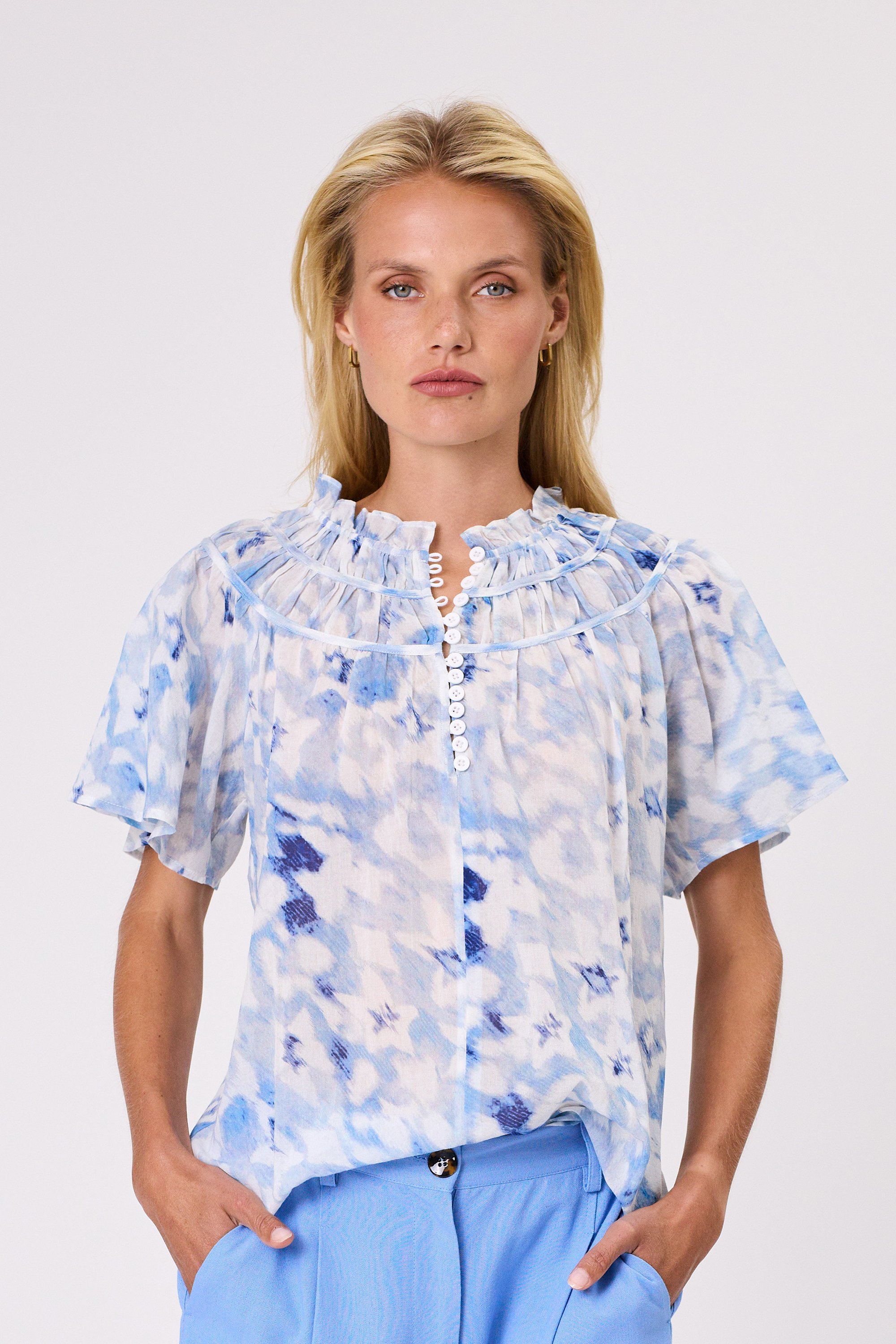 The Zadie Print is a must have this summer. Crafted in a beautiful drapey soft cotton fabric. It features frills and gathering detail around the neck. Raglan armhole and button up front placket opening.