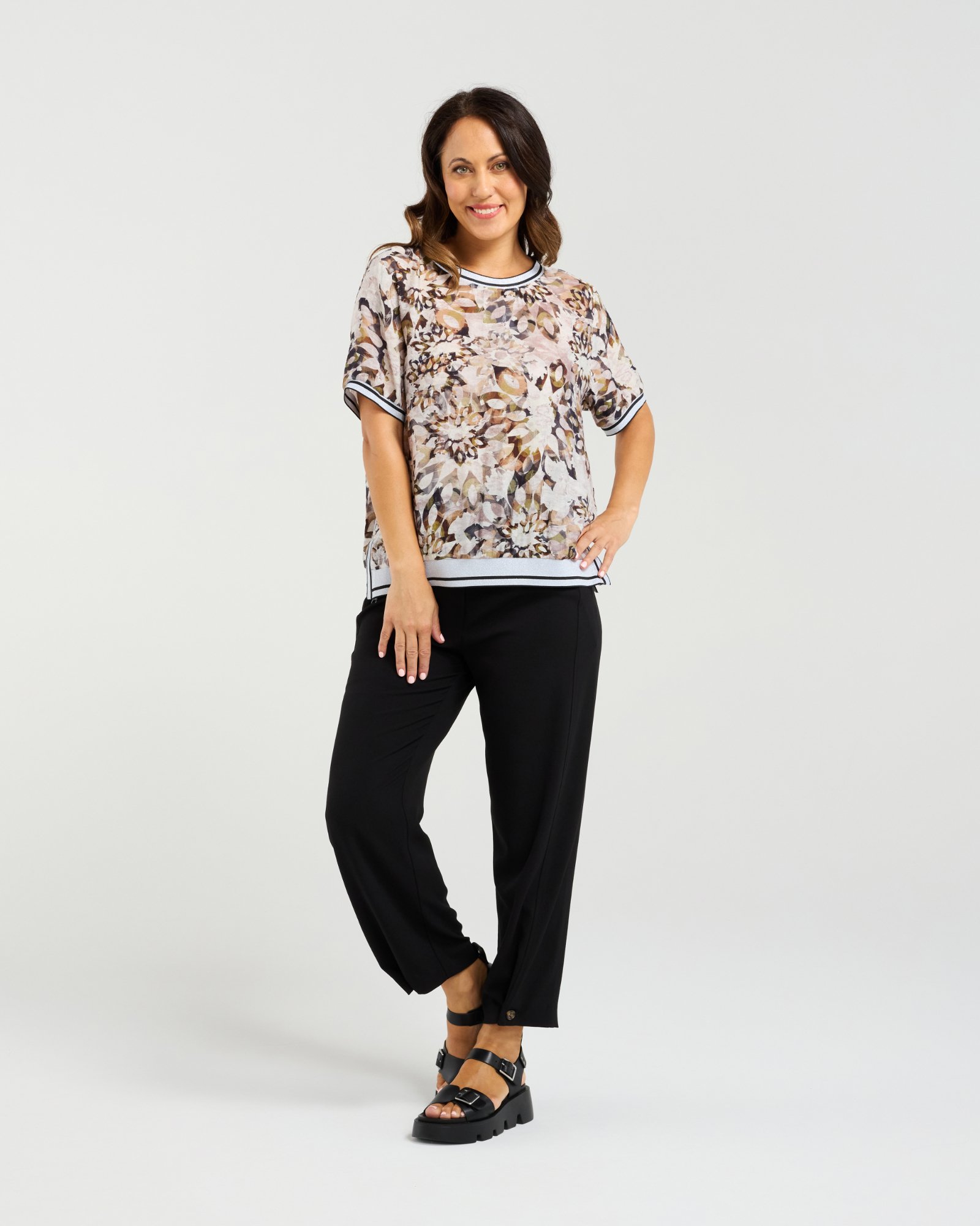 Designed with the relaxed silhouette and signature elastic trim at the neckline, cuffs, and hemline, this top combines comfort with effortless style. The look is refreshed with a neutral base highlighted by an abstract print, adding an artistic and earthy dimension to the piece. A versatile wardrobe staple with a contemporary twist.